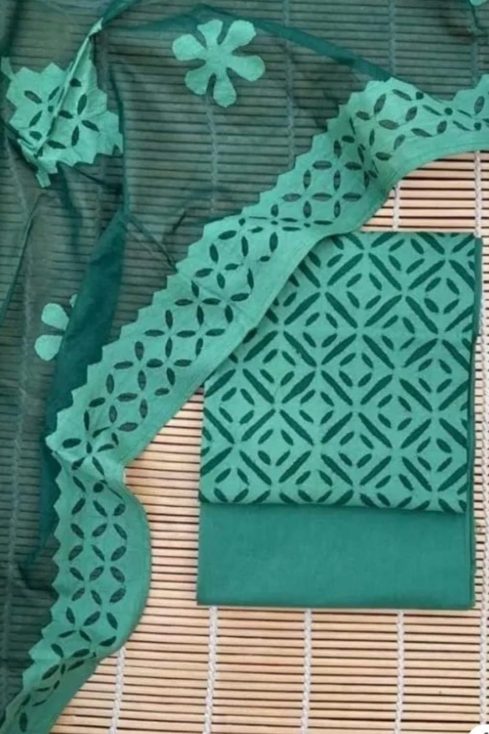Featuring beautifully detailed geometric cutwork patterns and a matching designer dupatta with scalloped borders, this outfit blends modern style with traditional charm. The soothing color and intricate detailing make it perfect for casual elegance, festive gatherings, or day events.